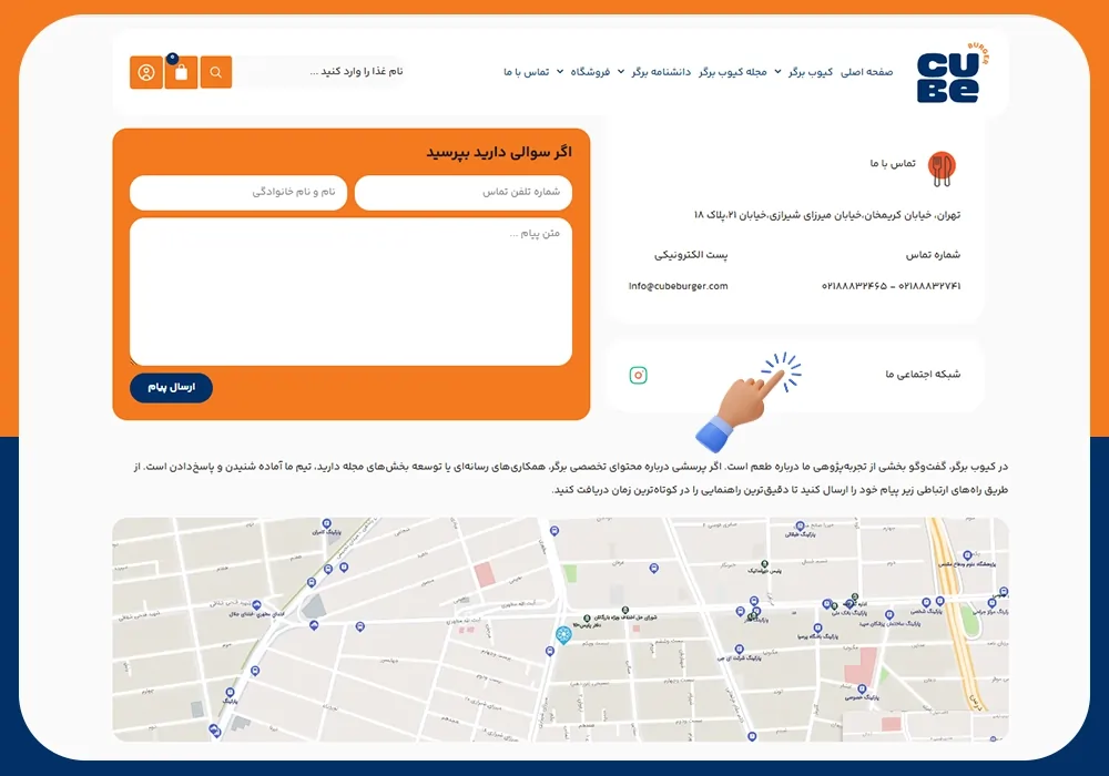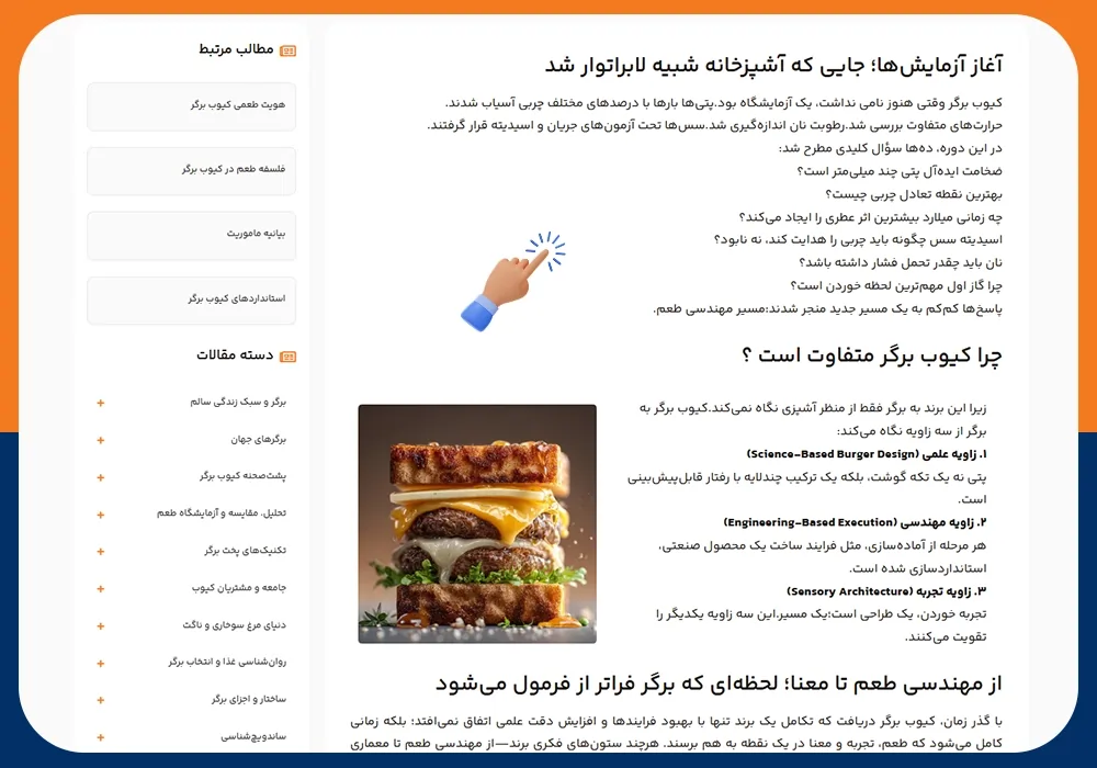 3. دانشنامهٔ برگر: بخش مقالات جامع که دربارهٔ تاریخچه برگر، ریشه های فرهنگی، نان و ساختار، پنیر و سس ها و انواع برگر می نوشت. این بخش نه تنها خلأ عدم وجود سایت را پر کرد، بلکه به کیوب برگر اعتبار تخصصی بخشید.