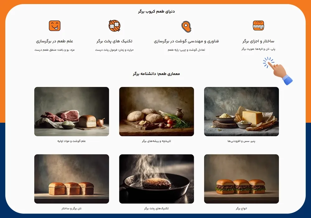 2. دنیای طعم کیوب برگر: در این قسمت، چهار زیر‌بخش علمی معرفی شدند: ساختار و اجزای برگر (پتی، نان و لایه ها)، فناوری و مهندسی گوشت و چربی، تکنیک های پخت و علم طعم و عطر. با وجود اینکه برند قبل تر سایت نداشت، این بخش به سرعت به مرجعی برای علاقه مندان تبدیل شد.