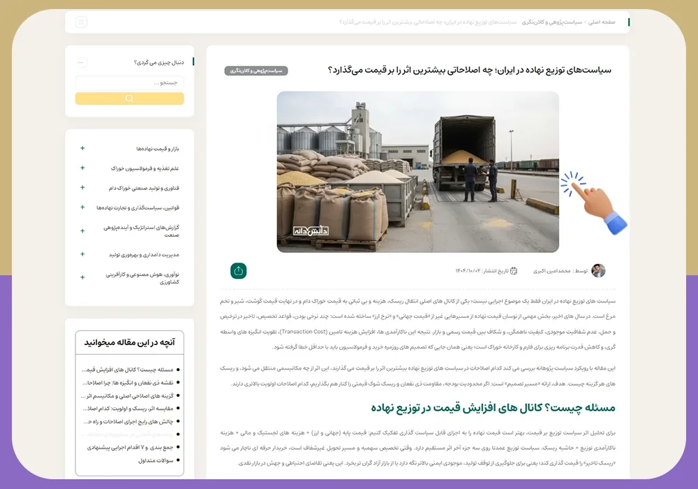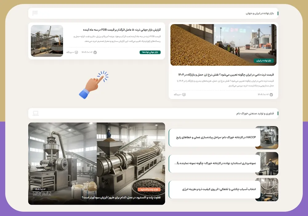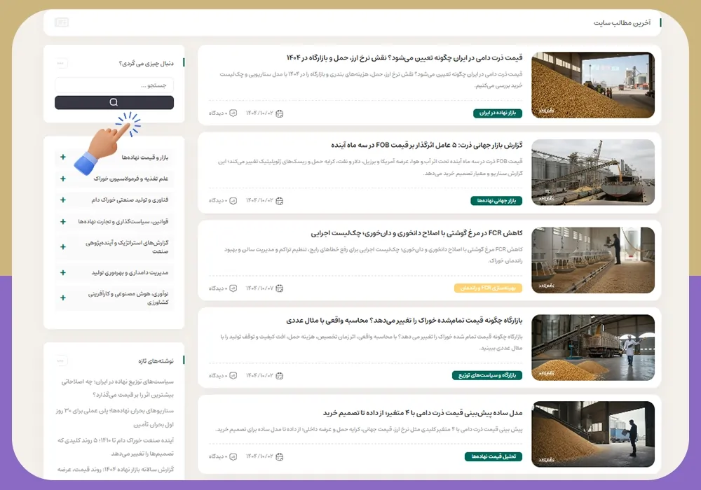 اما نکته مهمتر، وجود زیرموضوعهاست؛ چون در صنعت نهاده، تصمیمها روی موضوعات جزئیتر گرفته میشود. برای مثال در بازار، مسیرهایی مثل بازار داخلی/جهانی، سازوکارهای توزیع و تحلیل قیمت معنا دارد؛ و در تغذیه، موضوعاتی مثل جیرهنویسی، مکملها و افزودنیها، بهبود راندمان و سلامت گله. این زیرموضوعها همان نقطهای هستند که تولید محتوا را از «عنوانهای کلی» به «مقالات کاربردی» تبدیل میکنند.
