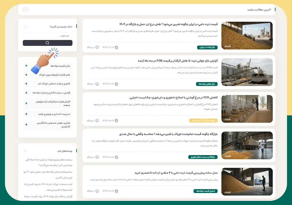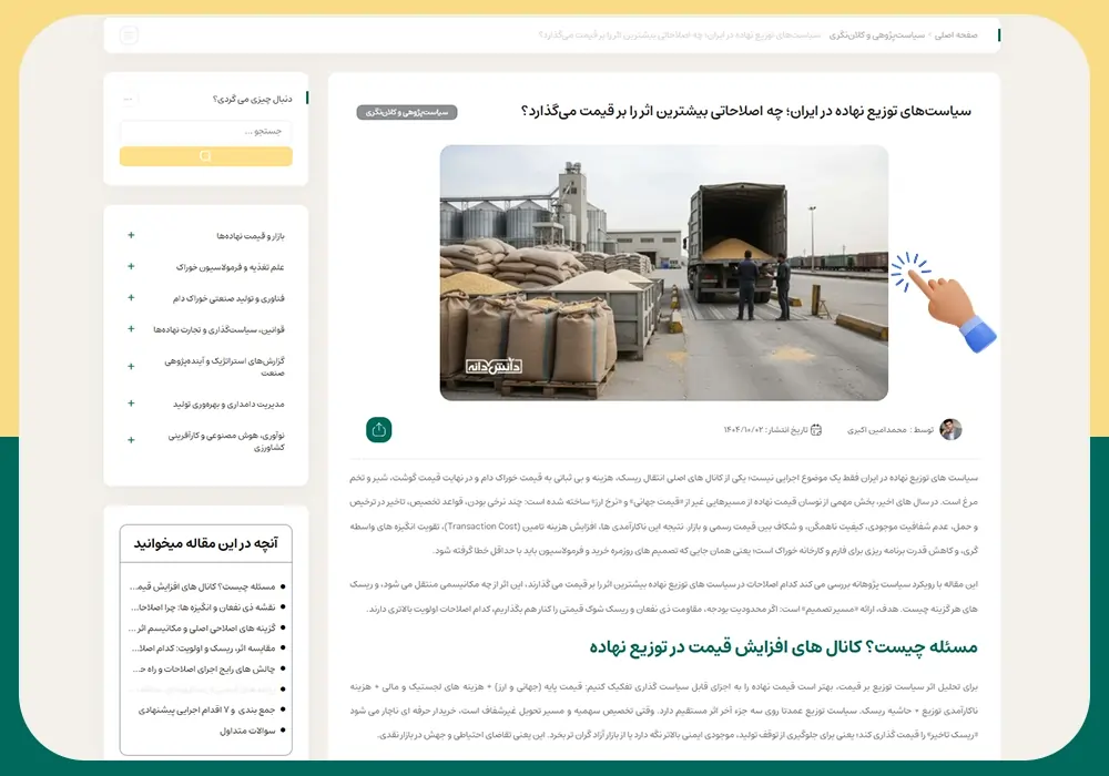 اما نکته مهم‌تر، وجود زیرموضوع‌هاست؛ چون در صنعت نهاده، تصمیم‌ها روی موضوعات جزئی‌تر گرفته می‌شود. برای مثال در بازار، مسیرهایی مثل بازار داخلی/جهانی، سازوکارهای توزیع و تحلیل قیمت معنا دارد؛ و در تغذیه، موضوعاتی مثل جیره‌نویسی، مکمل‌ها و افزودنی‌ها، بهبود راندمان و سلامت گله. این زیرموضوع‌ها همان نقطه‌ای هستند که تولید محتوا را از «عنوان‌های کلی» به «مقالات کاربردی» تبدیل می‌کنند.