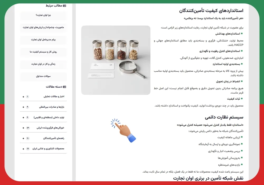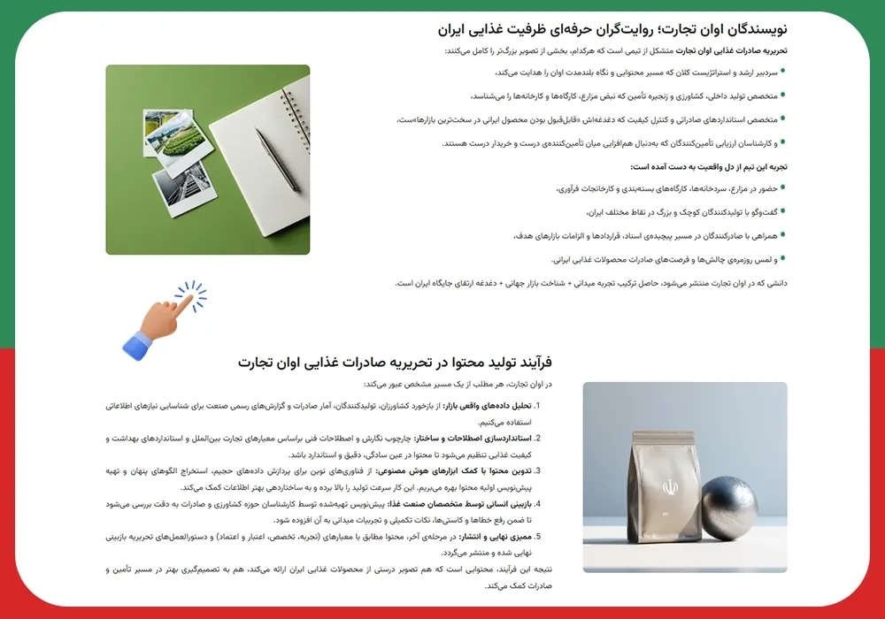 این بخش کمک می‌کند اوان تجارت صرفاً فروشنده دیده نشود و به‌عنوان یک مرجع قابل اتکا در حوزه تأمین و صادرات شناخته شود.