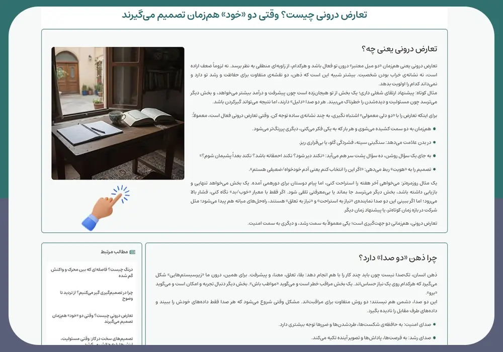 مقالات این سایت، صبر مخاطب را مفروض میگیرند و در عوض، به او احترام میگذارند. این احترام در طول متن قابل لمس است: عجلهای برای رسیدن به نتیجه نیست، متن به مخاطب فرصت میدهد فکر کند و حتی مخالفت کند. این رابطه، یک رابطه برابر است، نه رابطه معلم–شاگرد یا فروشنده–مشتری.