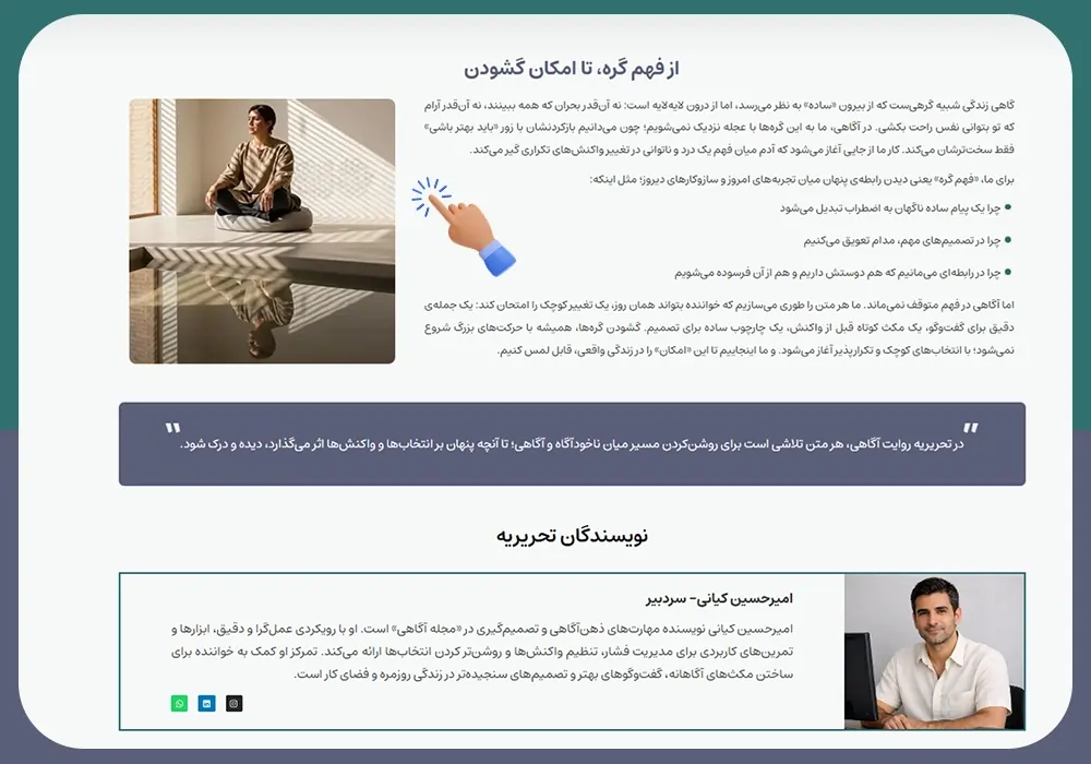 موضوعات مختلف، اگرچه متنوعاند، اما حول محورهای مشترکی میچرخند: خودآگاهی، تصمیم، هیجان، رابطه با خود و جهان. این تکرار مفهومی، نه نشانهی محدودیت، بلکه نشانهی تمرکز است. مخاطب بهمرور میتواند تشخیص دهد که یک متن «متعلق به آگاهی» است، حتی بدون دیدن نام سایت.